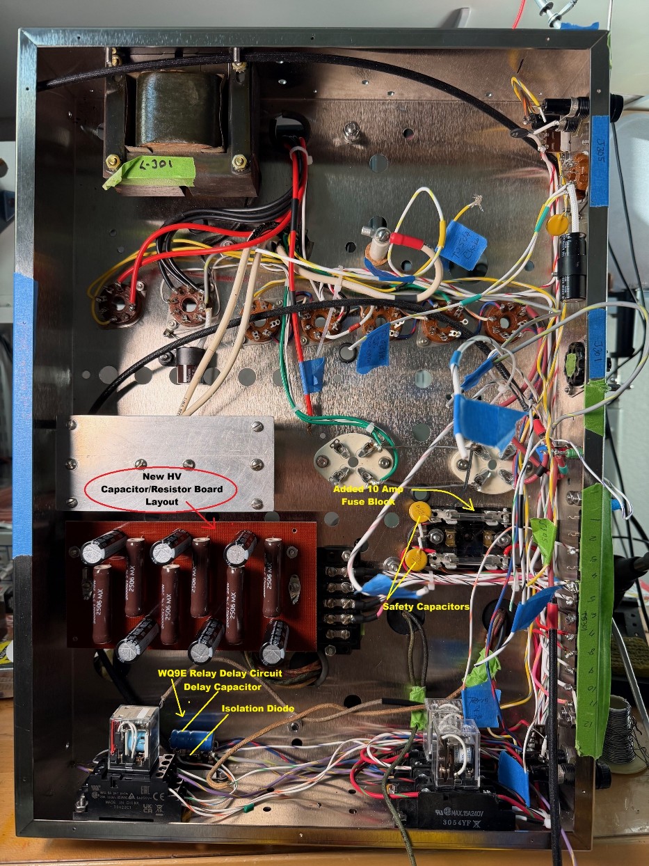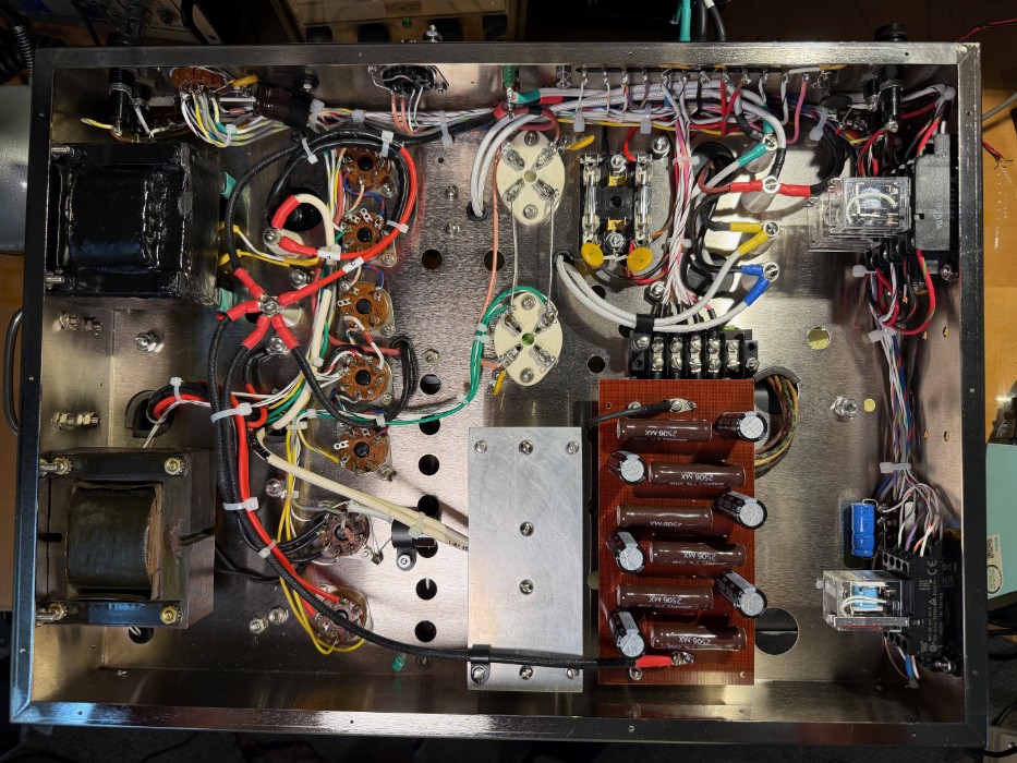 The photo shows the major components mounted on the chassis to verify mounting of newer style components, such as relays to verify no conflicts in placement. Wiring has been started; however, a new transformer ordered from Hammond has been delayed for a few weeks. The plan is to have the unit completed and ready for testing in March 2026.