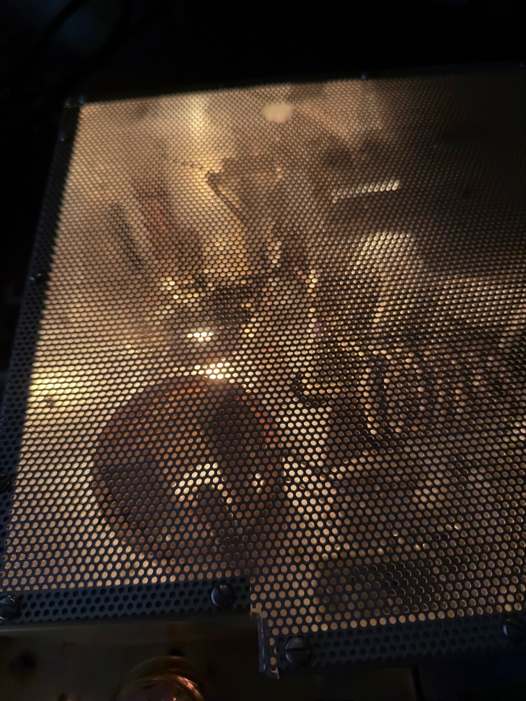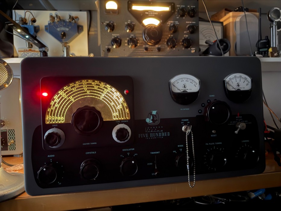 Eimac 4-400A lighting up the interior of its RF cage; the tube loafs along in this transmitter and will likely last for decades if tuned properly.
