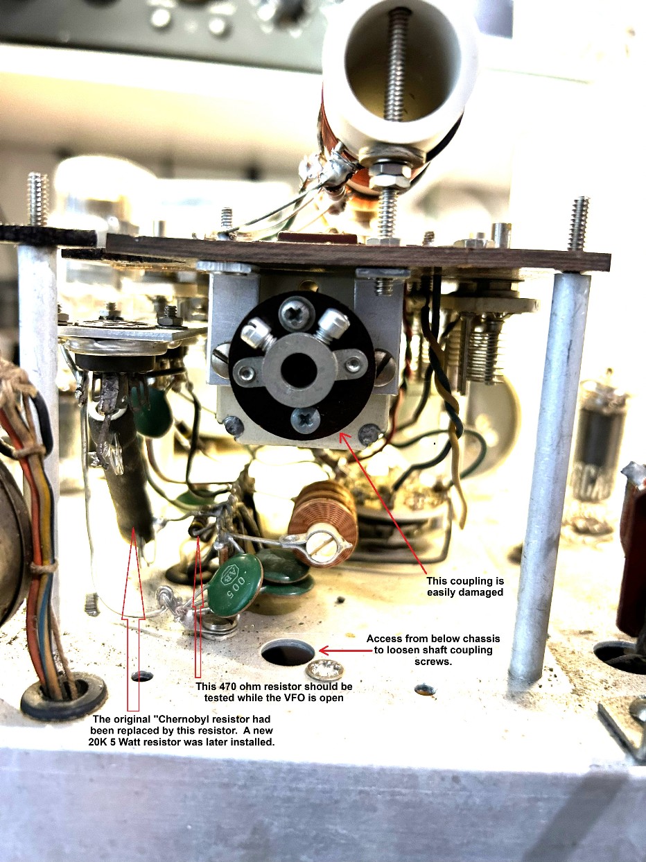 Photo showing the Flexible Coupling. The "Chernobyl" resistor had bee previously changed out. If you are this deep into the VFO, it is an opportunity to clean the rotary VFO switch seen in the background.