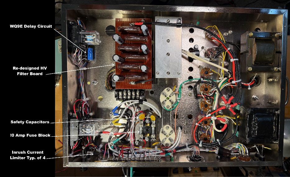 The photo shows the major components mounted on the chassis to verify mounting of newer style components, such as relays to verify no conflicts in placement. Wiring has been started; however, a new transformer ordered from Hammond has been delayed for a few weeks. The plan is to have the unit completed and ready for testing in March 2026.