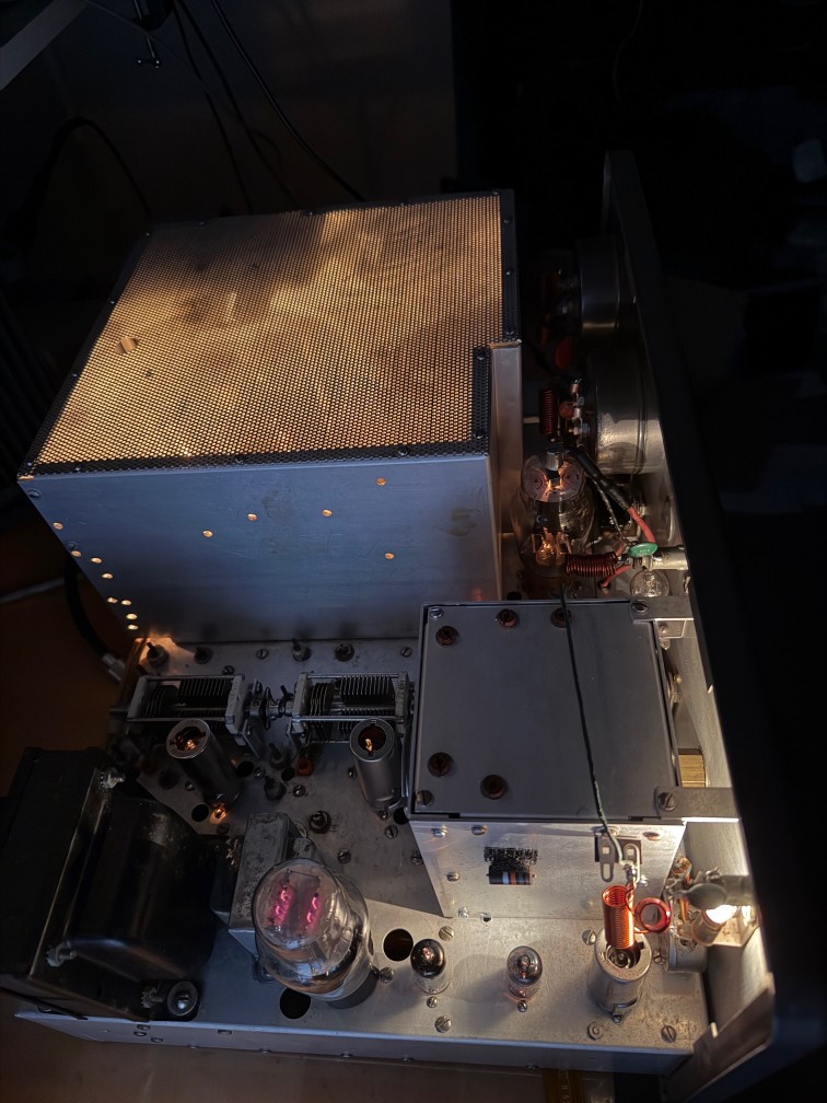 Eimac 4-400A lighting up the interior of its RF cage; the tube loafs along in this transmitter and will likely last for decades if tuned properly.